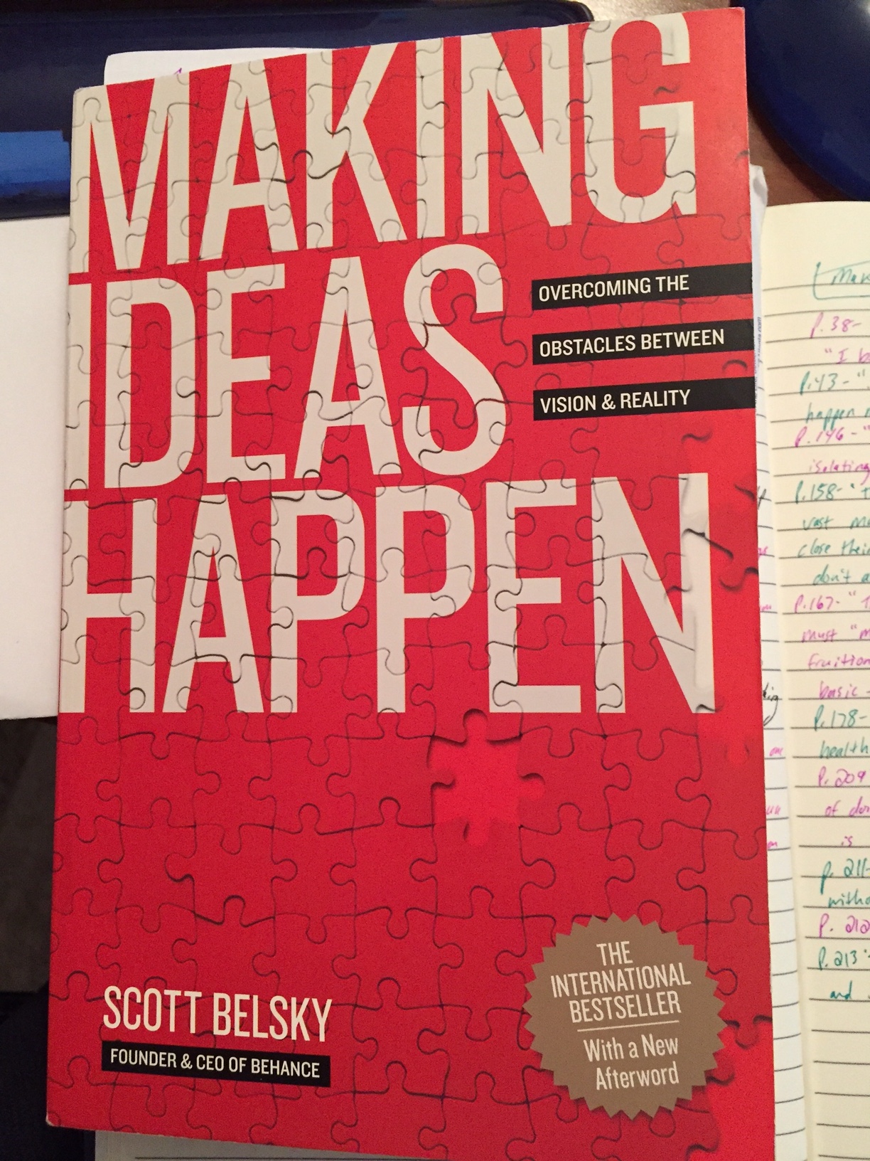 There are so many great quotes that I wrote in my reading journal from “Making Ideas Happen,” by Scott Belsky. P. 209 warns against the dangers of conventional wisdom. Conventional wisdom is often wrong. Entrepreneurs have all of the answers? No, says Andrew Weinreich on P. 211: “They’re just the ones willing to jump off a cliff without the answers.”